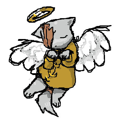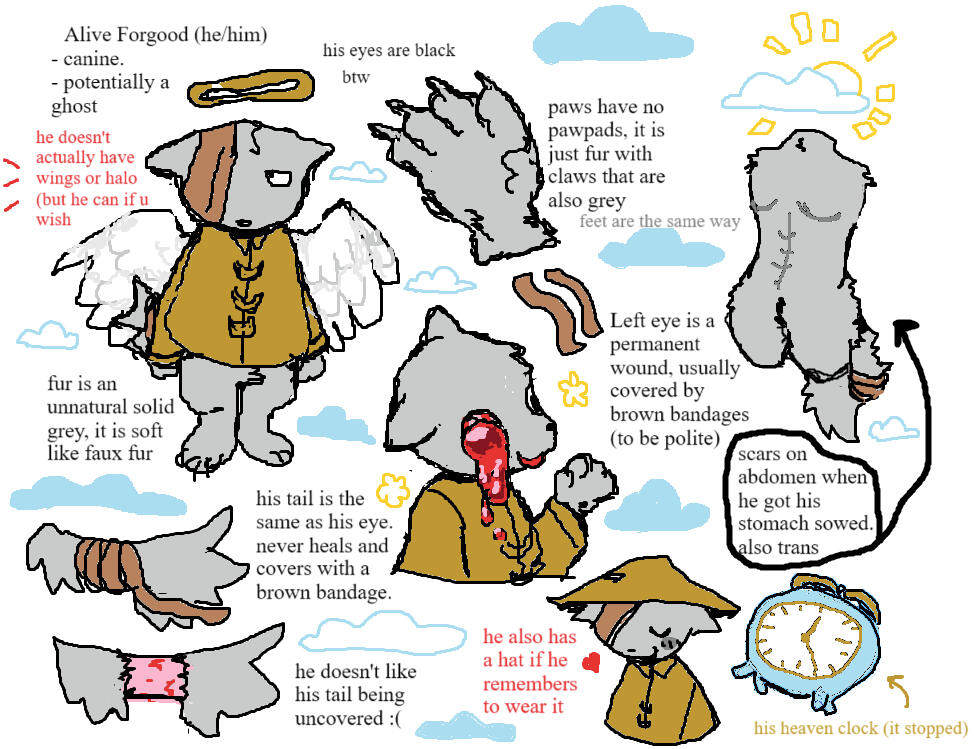 He's an ambiguous canine. His right eye and a small section of his tail are open, festering sores that skin never grows over and, if left unattended, will pour out his inwards! Luckily, Alive Forgood keeps brown bandages around to keep himself presentable. He doesn't feel pain from this. All his continuous exposed wounds are generally numb with dull and tingling sensations remaining. There is speculation that he may be a ghost.(He's nice...)